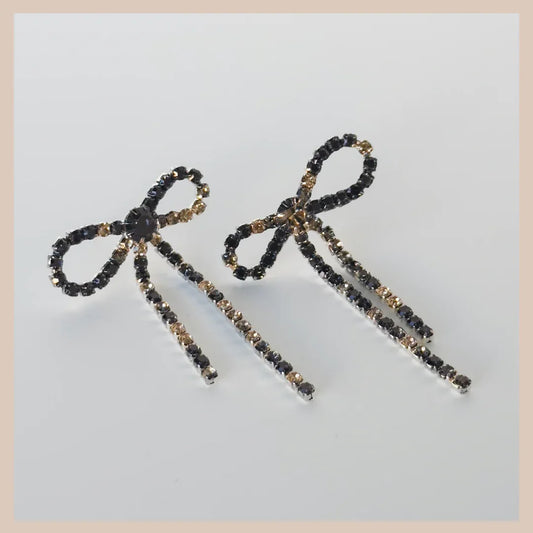 Black & Gold Enamel Bow Earrings – Crystal & Pearl Statement Studs