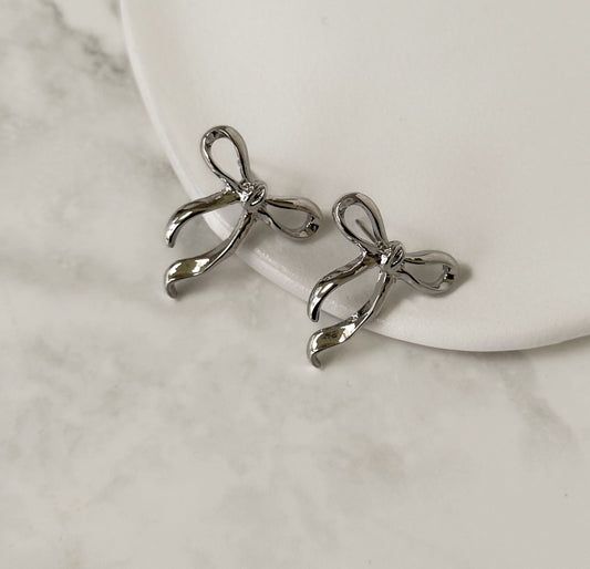 Ribbon Bow Stud Earrings - Silver