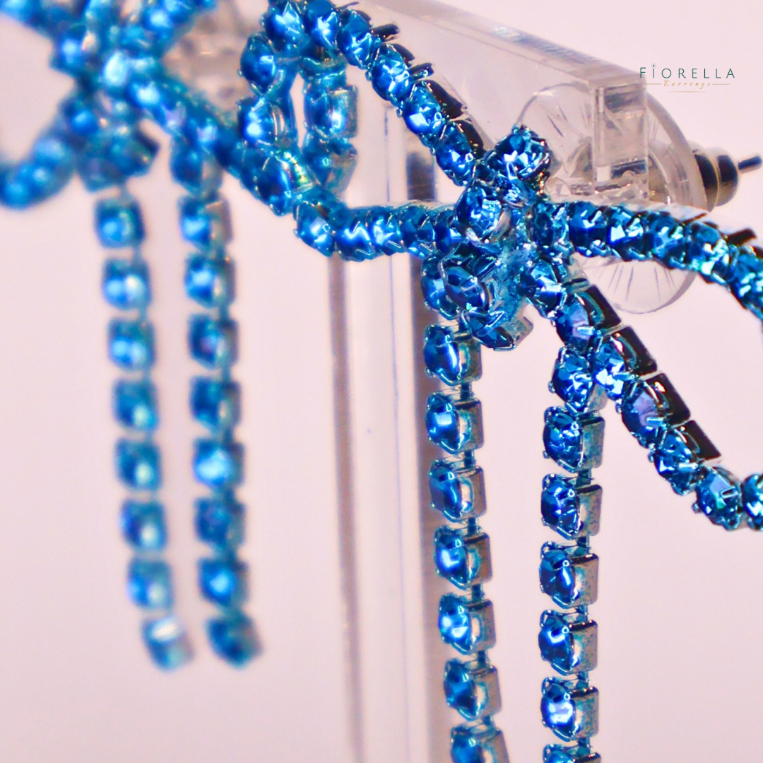 Meet the latest twist on our bestselling bow earrings — the Wide Bow Edition. With a bold 4 cm bow design and a shorter drop, these earrings bring just as much sparkle but in a playful, more structured silhouette. The sapphire-blue crystals shimmer beautifully, adding a rich pop of colour that feels elegant, confident and timeless.