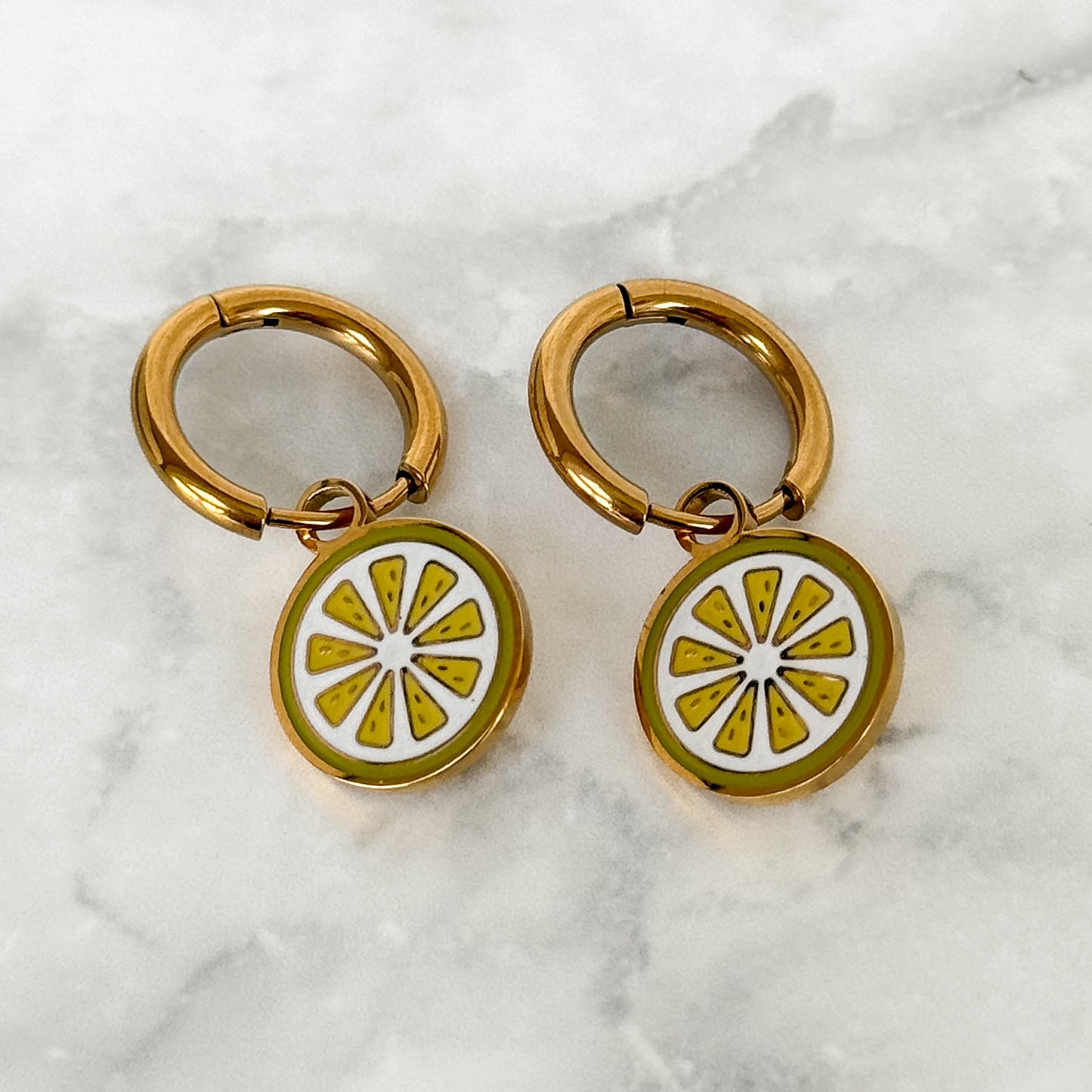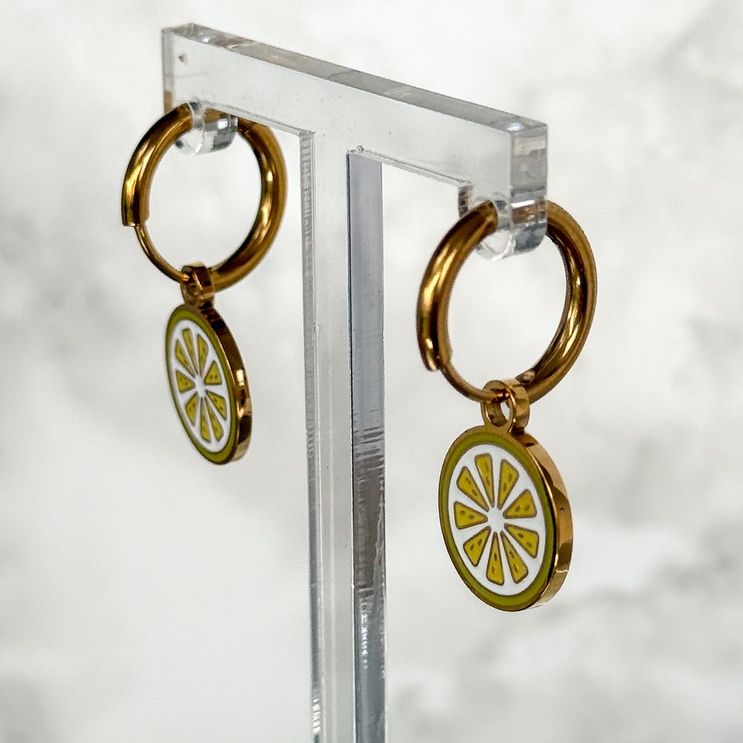 Featuring a vibrant citrus slice charm suspended from a polished gold hoop, these earrings are designed to add a fresh pop of colour while still feeling effortless and wearable. The delicate enamel detailing creates a playful lemon slice design that instantly lifts even the simplest outfit.