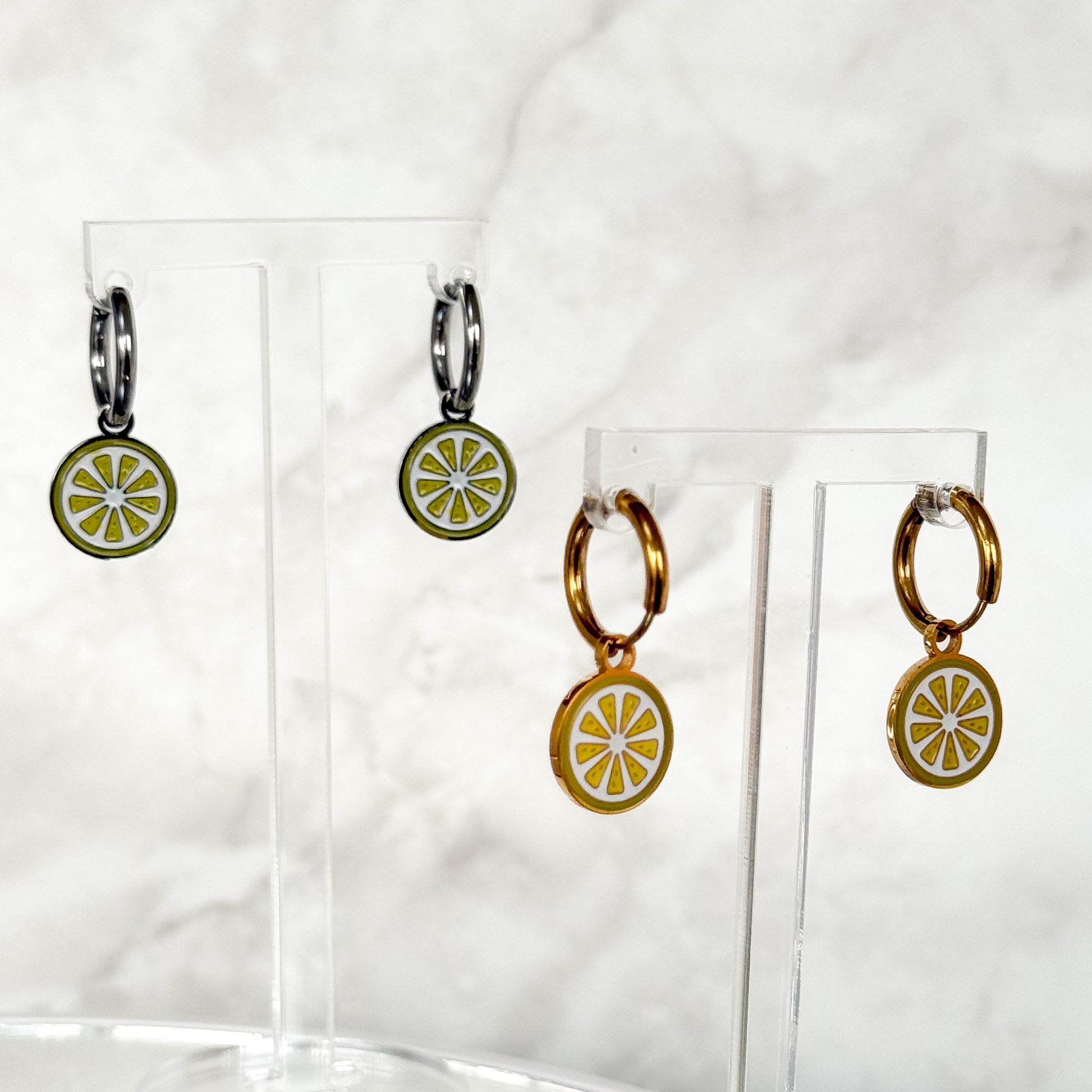 The polished silver hoop is paired with a detailed enamel citrus charm, creating a fun yet wearable piece that adds personality without overpowering your outfit. The bright lemon slice design brings a light, summery feel that works beautifully with both casual and dressed-up looks.