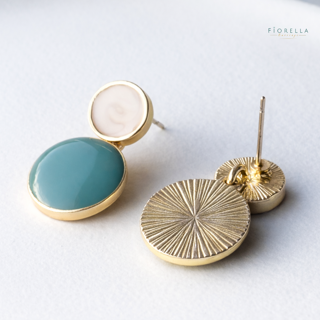 Soft, fresh and quietly striking — our Duck Egg Blue Luna Duo Studs pair a luminous pearlescent top disc with a glossy duck-egg blue enamel drop. The slightly larger lower disc creates a bolder silhouette while keeping the look elegant and easy to wear.