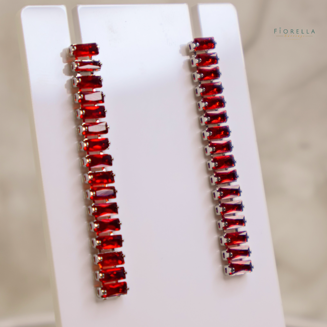 Add bold sparkle to your look with our Red Crystal Bar Drop Earrings. Designed with ruby-red baguette rhinestones in a sleek, elongated bar shape, these lightweight statement earrings are perfect for parties, evening outfits, festive events and year-round glam. Their long, elegant silhouette catches the light beautifully, making them a standout accessory for any occasion.