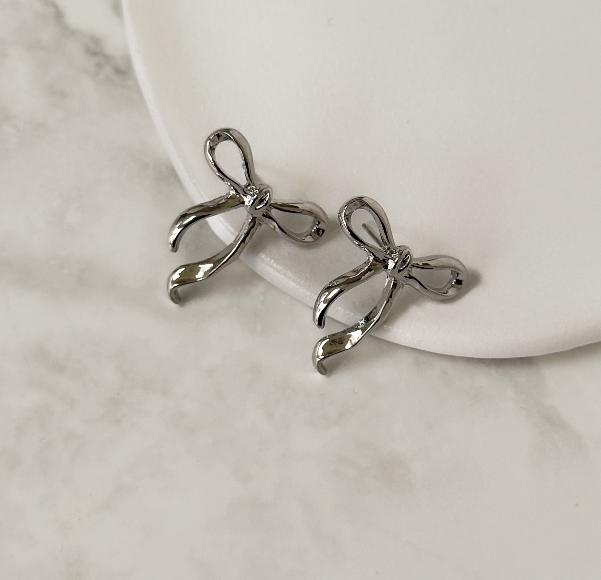 Sleek and modern, these silver ribbon bow stud earrings offer a fresh take on a feminine classic. The cool-toned finish highlights the sculptural curves of the bow, creating a refined look that feels effortless and contemporary.