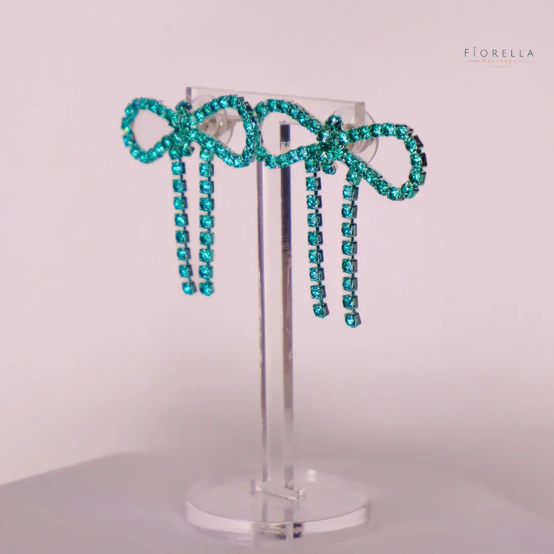 Meet the latest twist on our bestselling bow earrings — the Wide Bow Edition. With a bold 4 cm bow design and a shorter drop, these earrings bring just as much sparkle but in a playful, more structured silhouette. The teal crystals add a vibrant pop of colour that catches the light beautifully, perfect for brightening up any outfit.