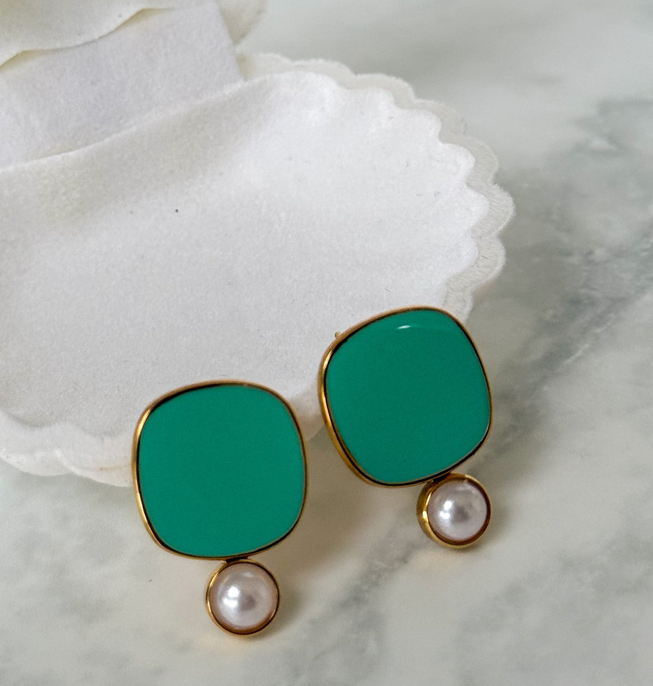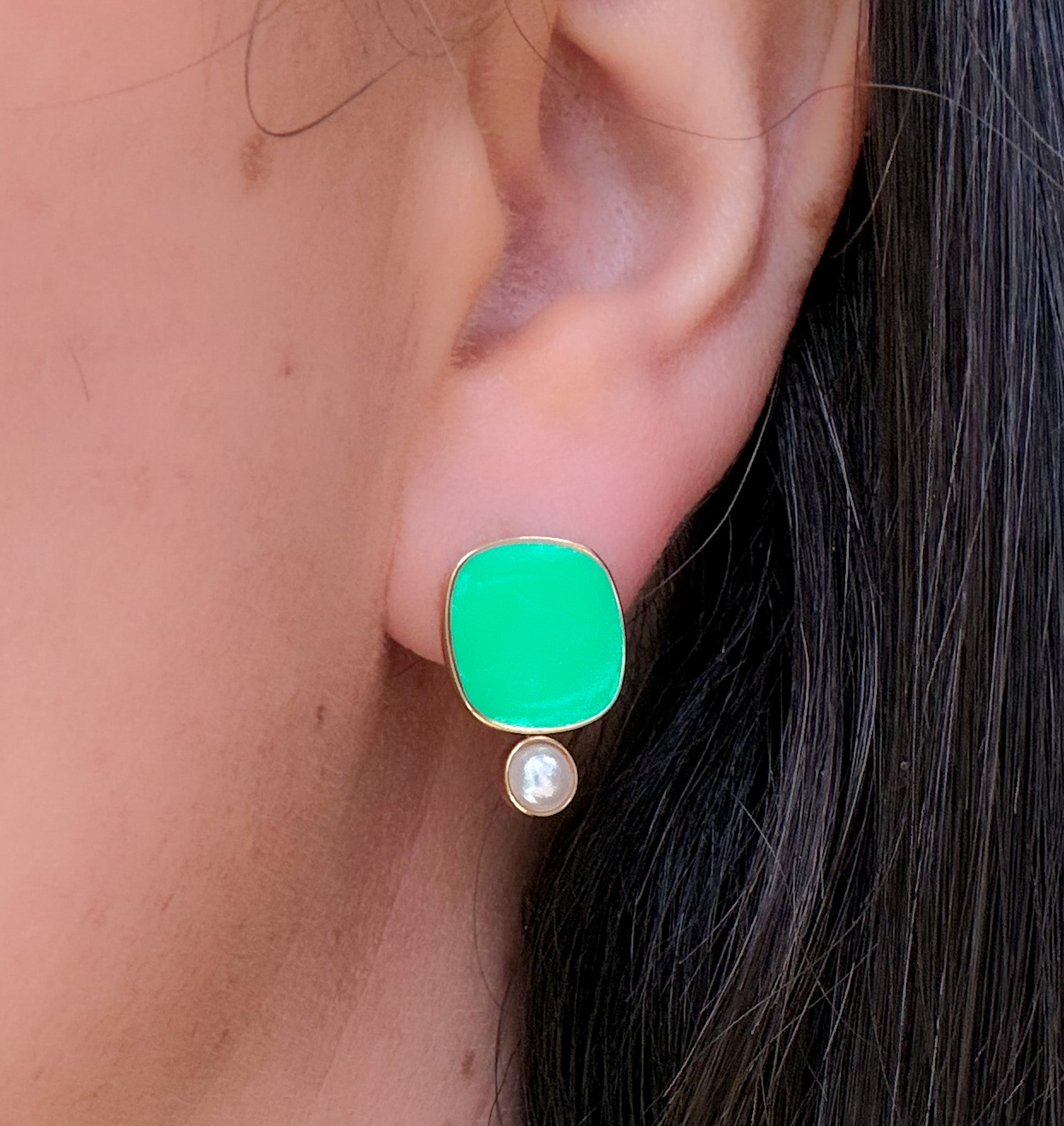 Bold but refined, the Aqua Pop Viva Colour Pearl Studs bring a confident hit of colour with a soft pearl finish. A smooth enamel square is framed in 18K gold plating and balanced with a delicate pearl drop, creating a modern statement that still feels effortless. Lightweight and easy to wear, they’re designed to lift everyday outfits while holding their own for evenings and occasions.