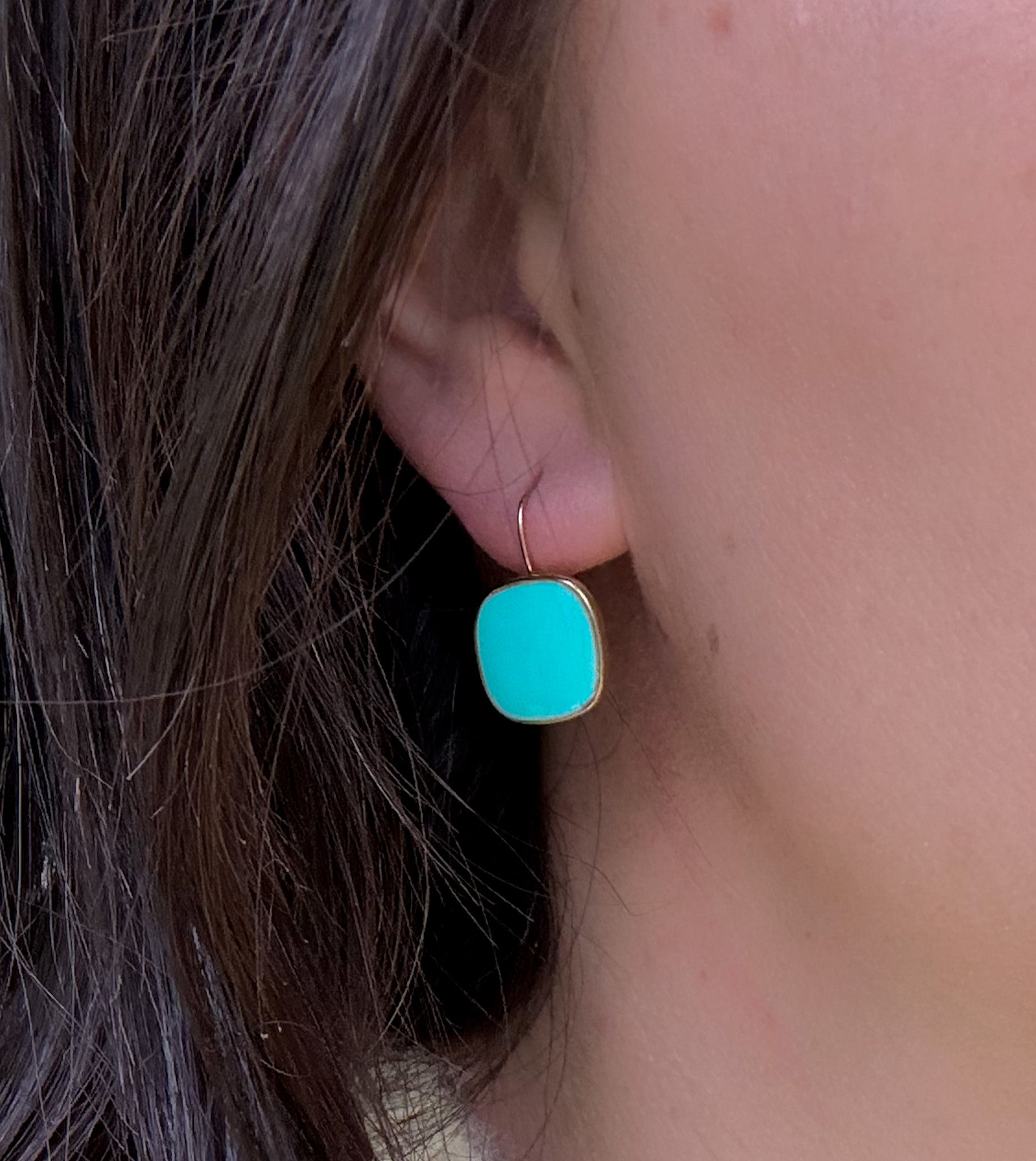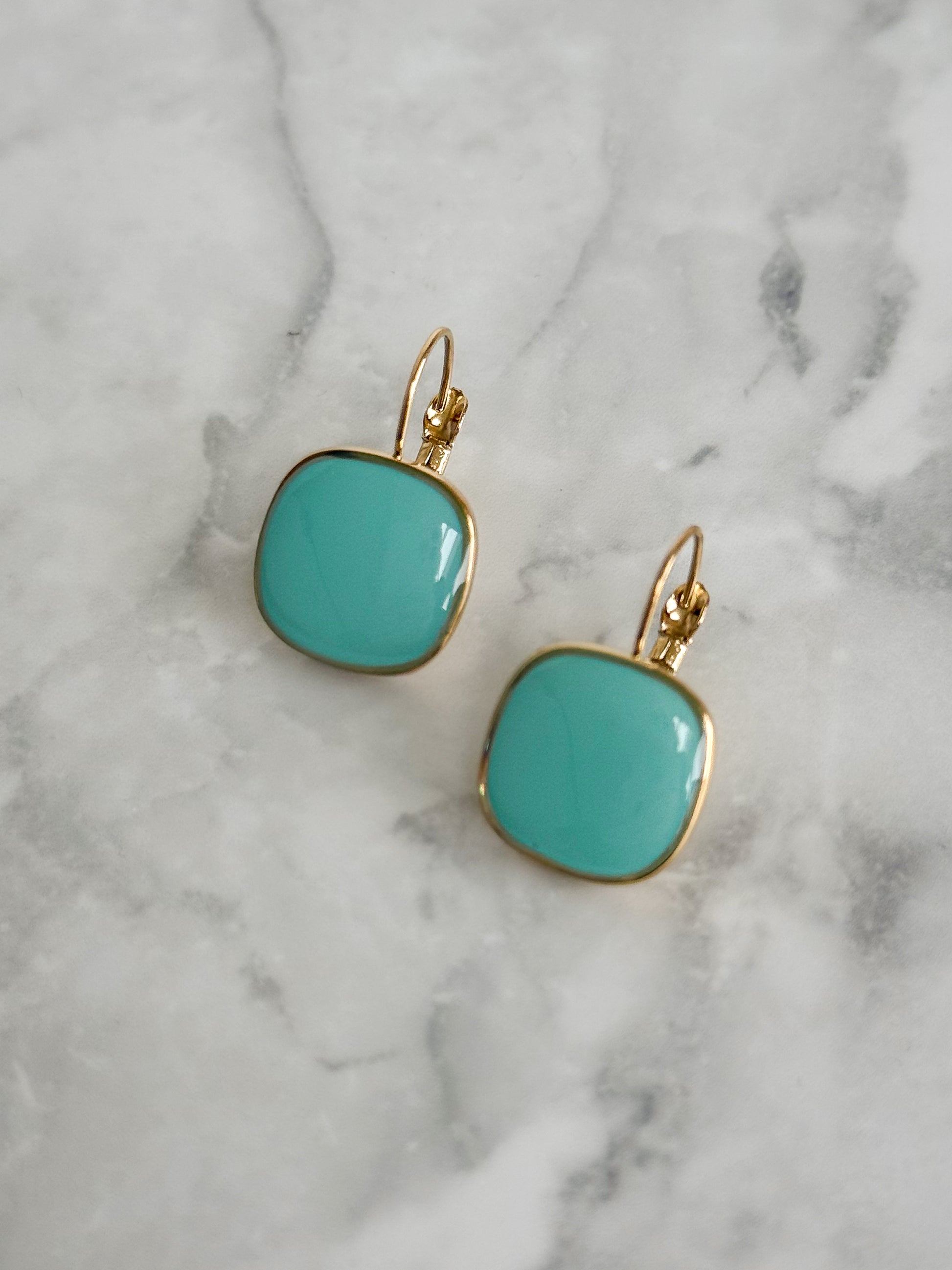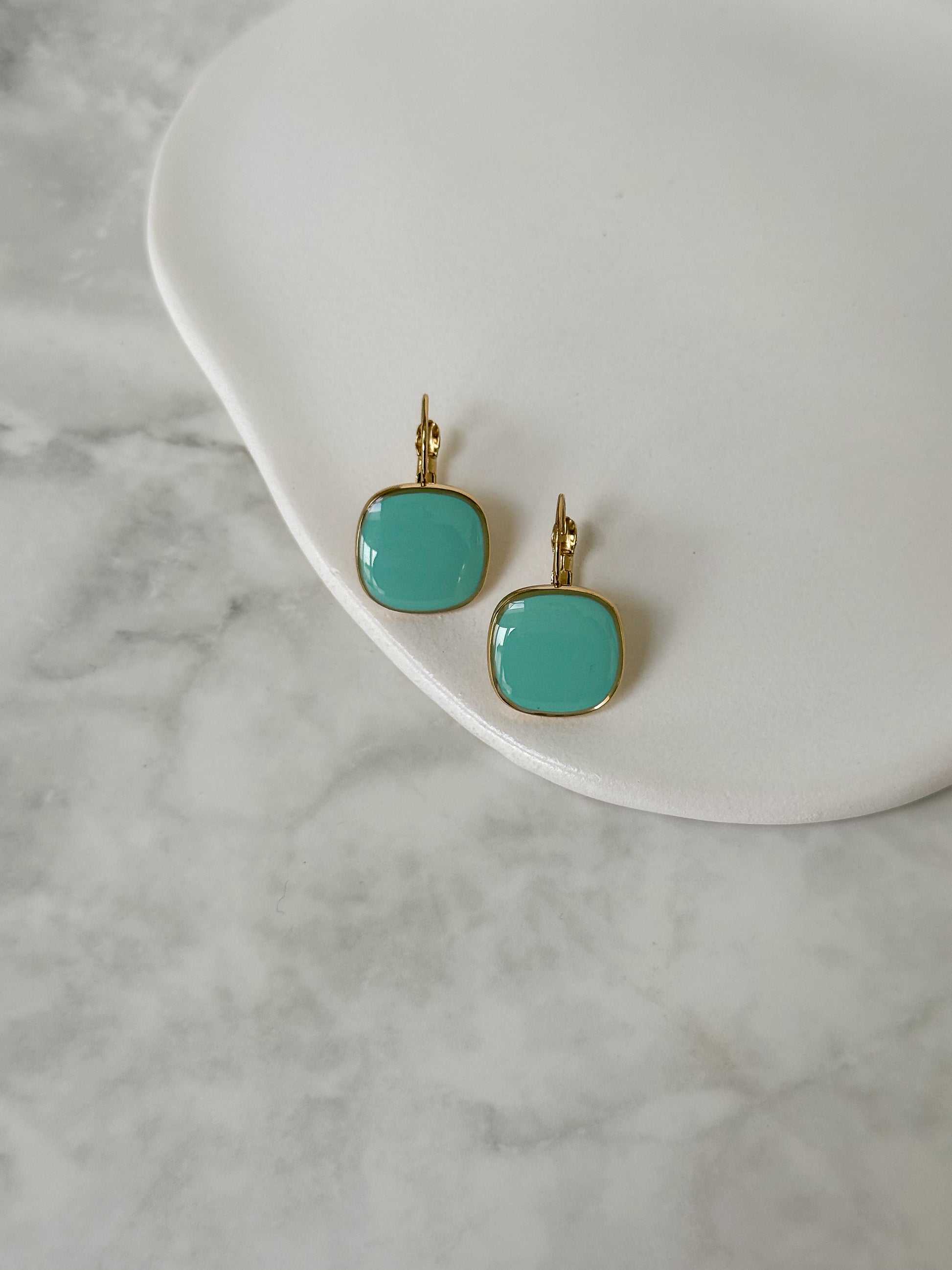 The Aqua Blue Viva Drop Earrings bring a cool, uplifting pop of colour to everyday looks. Finished in glossy enamel and framed in 18K gold plating, this softly rounded square design feels effortless yet considered.